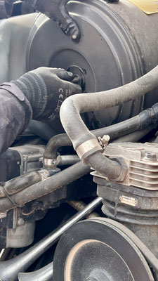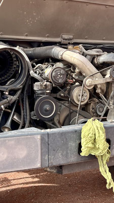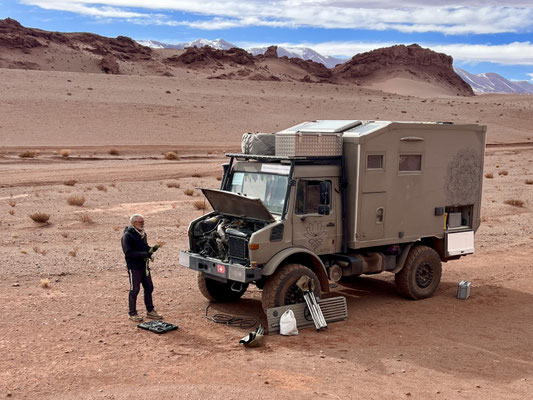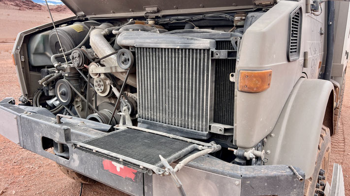 Auf dem weiteren Weg fordert uns die Höhe: Zum ersten Mal überhitzt der Unimog – das «Kühlwasser» kocht. Im Schneckentempo geht es weiter, immer wieder anhalten, Motor abkühlen lassen, und schliesslich doch noch die Passhöhe erreichen. Runter läuft er wie gewohnt problemlos. Wir vermuten Sand im Kühler – nach den letzten Stürmen keine Überraschung. Also: alles demontieren, reinigen, hoffen. Morgen zeigt sich, ob die Operation erfolgreich war.