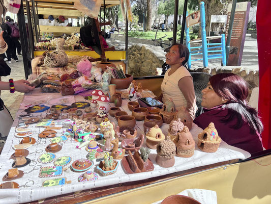 Auf dem grosszügigen Freiluftareal verschmelzen Kunst und Natur. Wir bestaunen Skulpturen von Tieren, Ahnen und Götterwesen, jede Figur erzählt eine Geschichte aus der Weltanschauung der Anden. Mit einem kleinen Heft – natürlich nur auf Spanisch – versuchen wir, die Symbolik zu entziffern. Besonders fasziniert mich der Schamane. Ob ich wohl je einem begegnen werde, einem echten, unverdorbenen, der kein Geld für seine Weisheit verlangt?